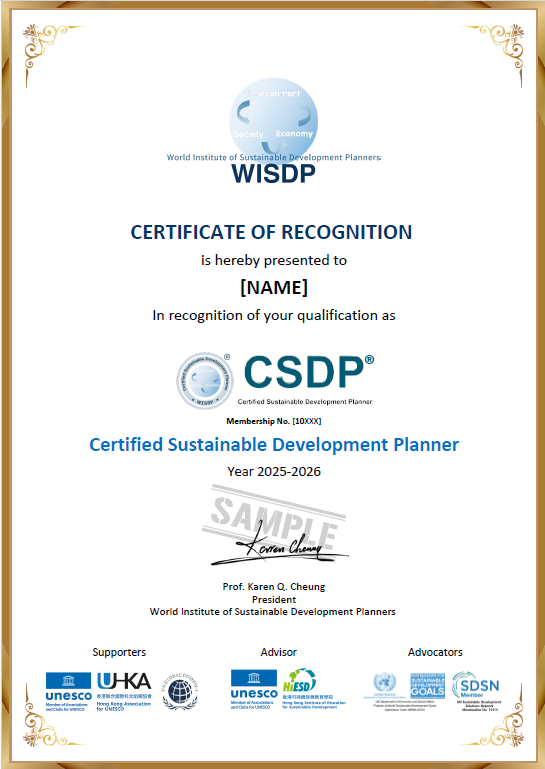 The Certified Sustainable Development Planner (CSDP®) certification is awarded by the WISDP to professionals who have met the standards in training and have accumulated work experiences in Sustainable Development Planning. These include professional standards in knowledge, competency, skills and culture. Recipients of the CSDP certification by WISDP can demonstrate his/her professionalism and capabilities in integrating sustainable development into their careers, industries as well as his/her career position. Certified Sustainable Development Planners of WISDP may use the “CSDP®” Designation and CSDP Logo to identify his/her professionalism in sustainable development.